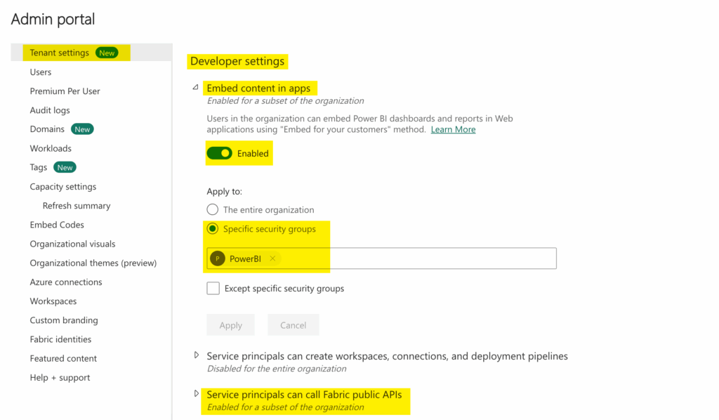 - Repeat the last two steps for the setting Service principals can call Fabric public APIs.