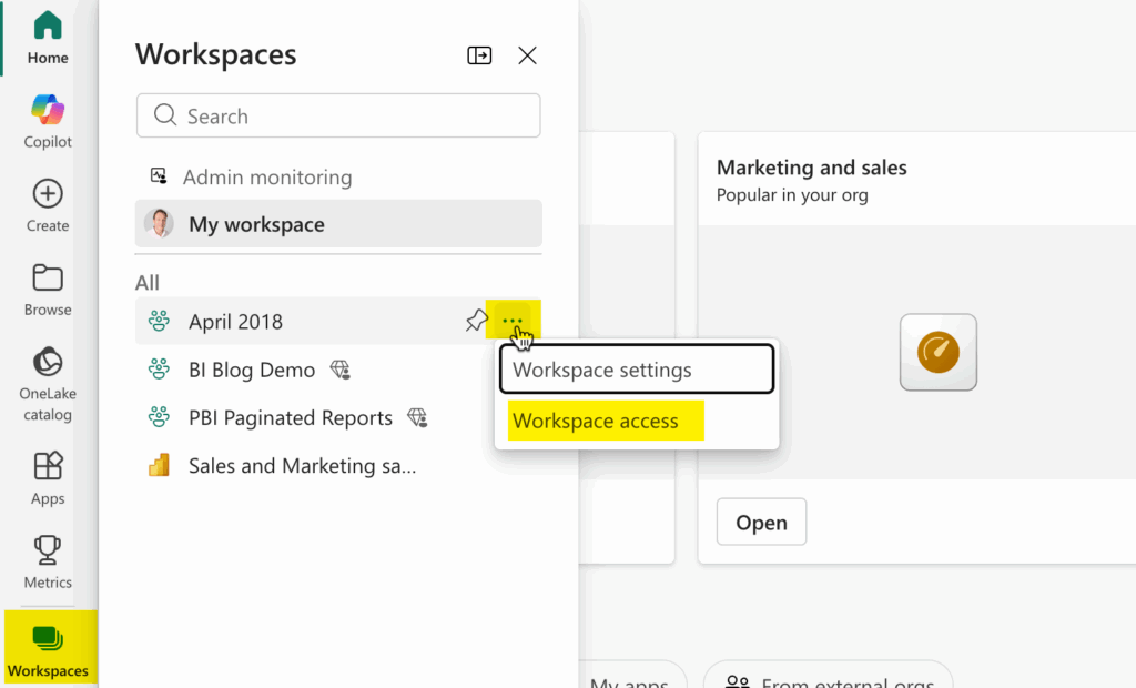 To grant a service principal access to a workspace, you need to enter its full display name. Power BI won’t be able to locate it if you search by its ID or other identifiers.