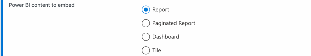 - Select the type of Power BI content that you wish to embed – for example a (Paginated) Report or Dashboard.