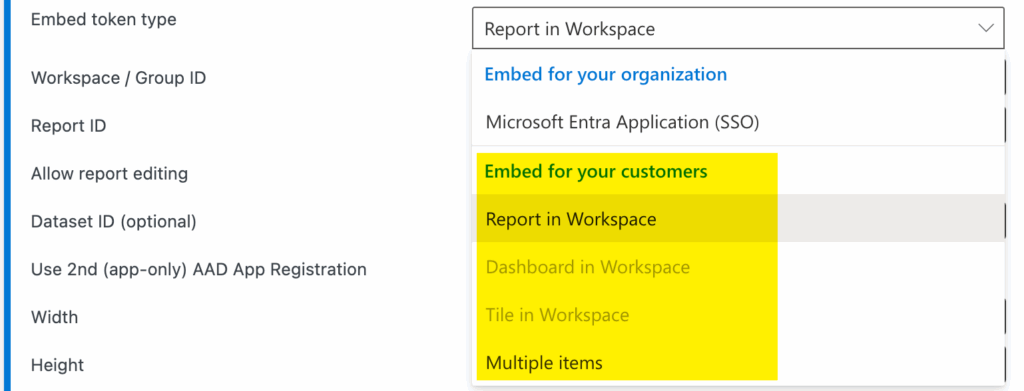 - Choose the Embed token type that matches the selected content type (e.g. report) and that is listed in the group Embed for your customers.