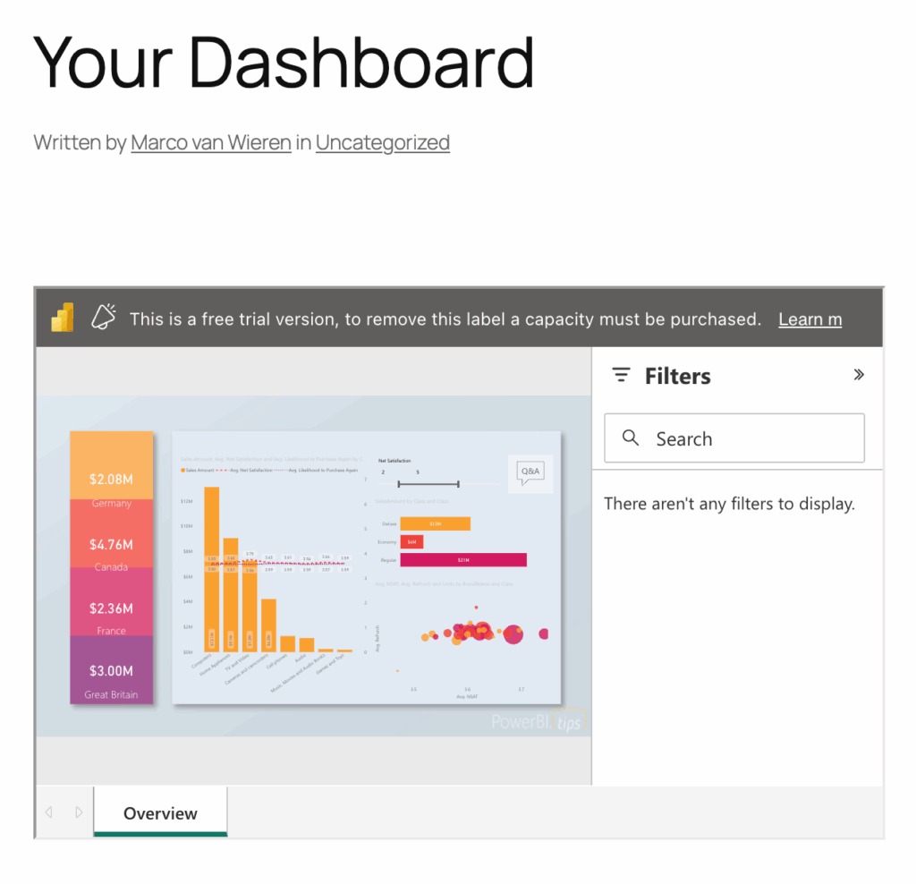Please note that if you embed Power BI content for your customers without having added the required premium capacity, the item will still show, but with a trial-warning – as shown below.